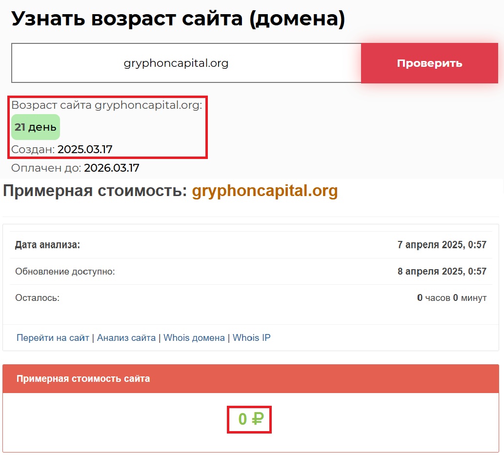 Дата регистрации сайта — 17 марта 2025 года. Всего три недели назад. А ведь настоящая финансовая платформа не может появиться вот так и сразу предлагать «уникальные инвестиционные возможности». Это просто смешно. Да и цена регистрации — всего ноль рублей. Вы серьезно думаете, что уважаемая компания с многомиллионными оборотами будет так дешево себя оценивать?
