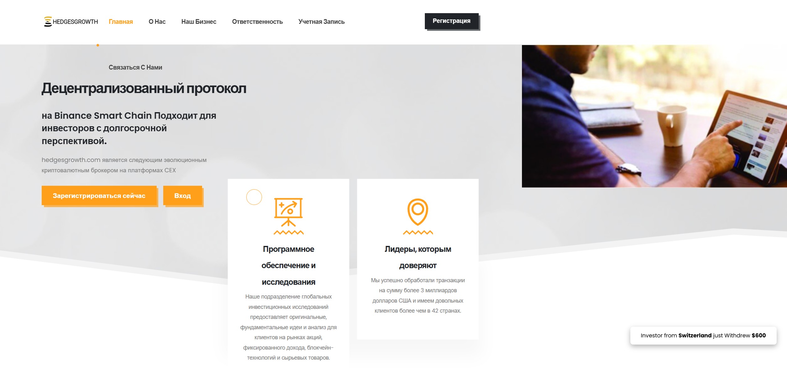 С чего начинается любой контакт с подобными платформами? Конечно, с сайта. Именно он — первое, что вы видите. Именно он должен вызывать доверие. Только вот hedgesgrowth.com, если уж быть честными, доверия не вызывает. Посмотрите на него внимательно: знакомый до боли шаблон, который, кажется, видели уже десятки раз.