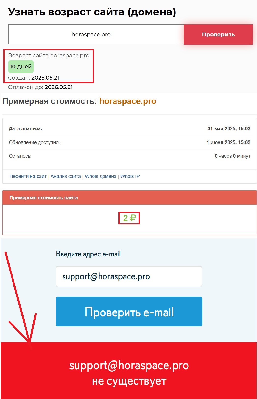 Контактные данные? Их просто нет. Ни телефона, ни чата, почта support@horaspace.pro — фальшивая. Связаться с представителями Hora Space невозможно. Попробуйте — и вы увидите: никакой поддержки нет, это пустышка. А ведь серьезная финансовая компания не станет скрываться от своих клиентов, верно? Отдельно стоит упомянуть стоимость ресурса. Мы провели проверку — всего два рубля.