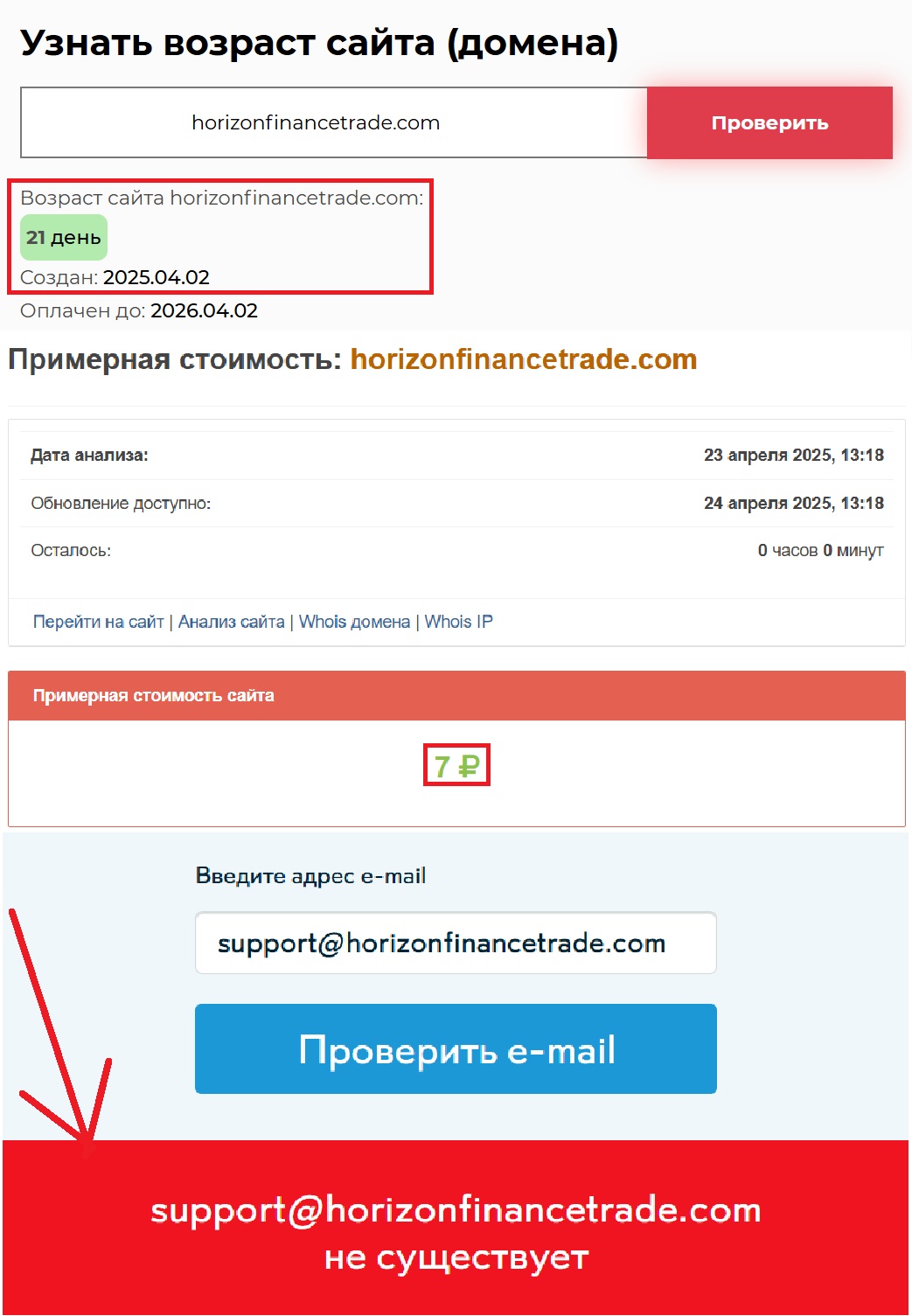 Если бы дело было только в пустых обещаниях, можно было бы сказать: «Ну ладно, бывает». Но здесь все куда серьезнее. Сам сайт — horizonfinancetrade.com — с виду вроде бы ничем не выделяется, а при ближайшем рассмотрении вызывает массу вопросов. Начнем хотя бы с его стоимости. Семь рублей!. Да-да, по данным сторонних сервисов, именно столько оценивается эта «инновационная» платформа. Можете сами сравнить с любым настоящим брокером — там суммы порой переваливают за сотни тысяч, а здесь… даже смешно.