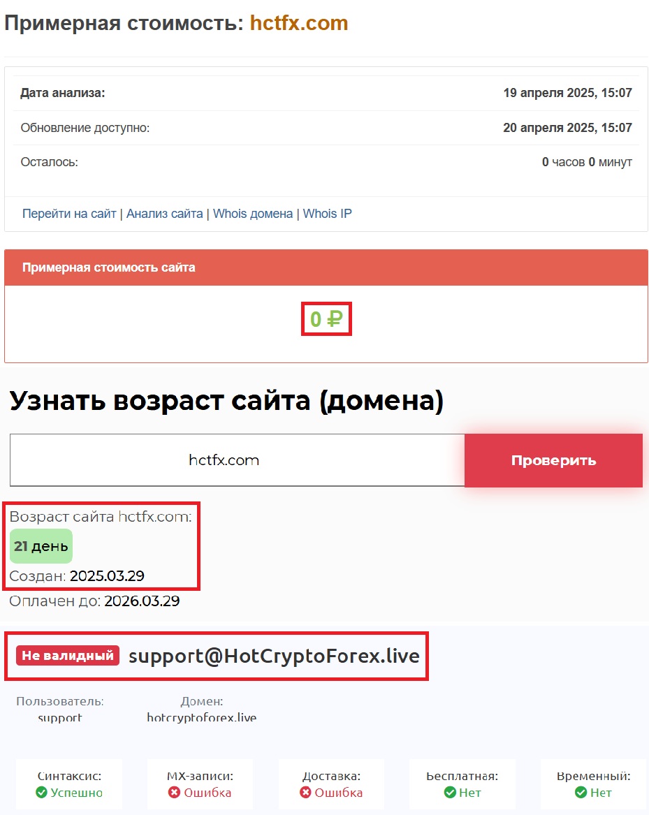 Мы не поленились и проверили: в базе Центрального банка Российской Федерации нет и намека на Hot Crypto Forex. У проекта нет ни лицензии, ни регистрации, ни даже нормального юридического адреса. Официальных контактов тоже — ноль. Электронная почта support@hctfx.com полностью фейковая. Телефона нет. Ищите ветра в поле.