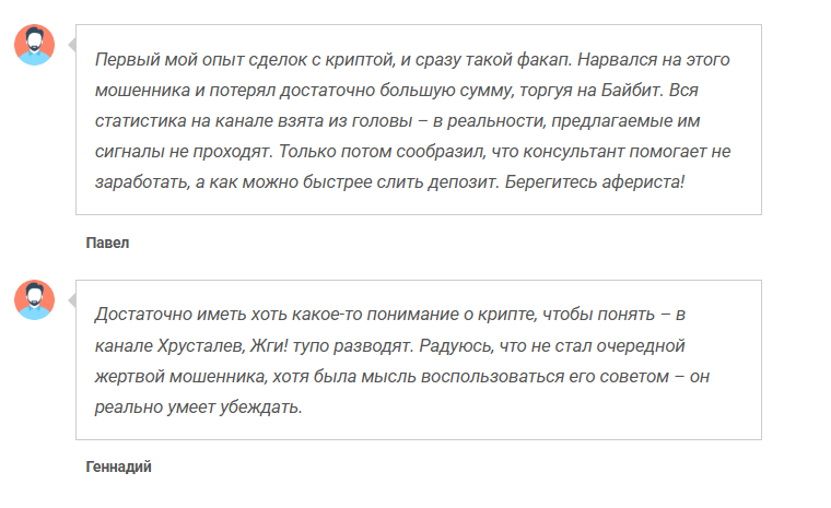 Что известно о названом сообществе? Его автором является некий Марк Хрусталев. Канал посвящен криптовалютам и сделкам с ними. Лента пространства состоит из постов с аналитикой, обзоров цифровых активов и бирж, торговых сигналов. Здесь есть статьи, графики и даже видеосообщения. С услуг Марк предлагает персональные консультации, копитрейдинг, бонусы за переход по партнерским ссылкам. Однако поднять какие-то деньги при сотрудничестве с Хрусталевым определенно невозможно. Его канал изначально создавался с целью развода наивных и неопытных инвесторов.