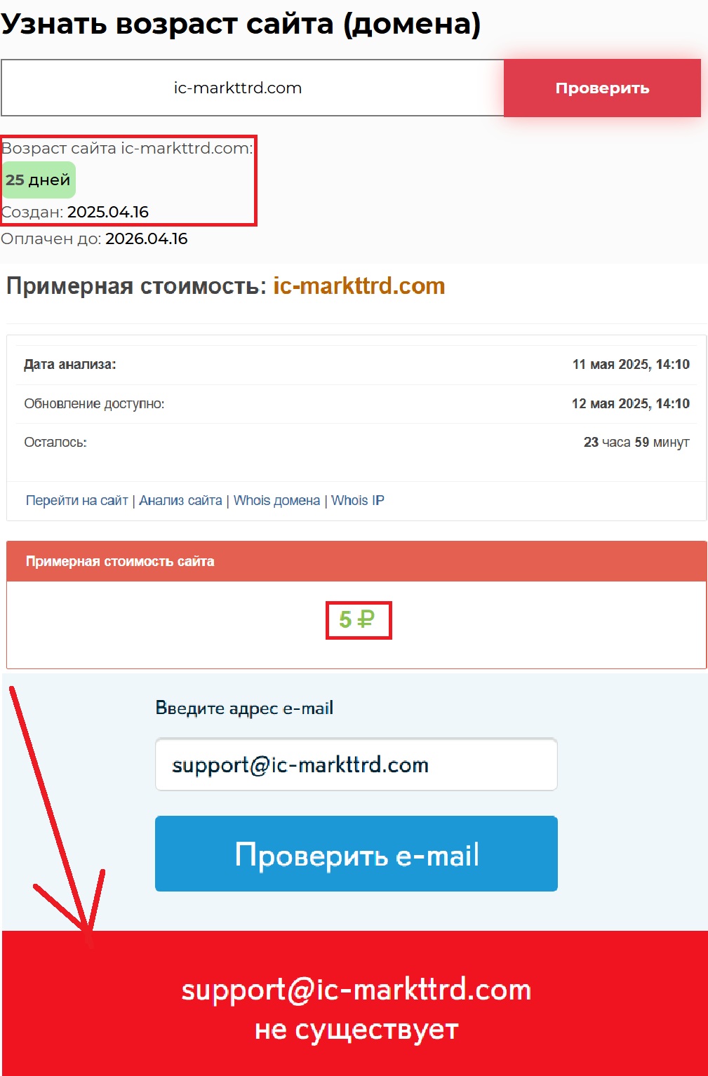 Еще один интересный момент — контактная информация. Указана электронная почта support@ic-markttrd.com, которая не отвечает. А «офис в США», как выяснилось, не существует вовсе. Поддельный адрес — классика. Все это делается для того, чтобы создать иллюзию масштабной международной компании. Хотя по факту — перед нами сайт, который, к слову, оценен всего в жалкие пять рублей.