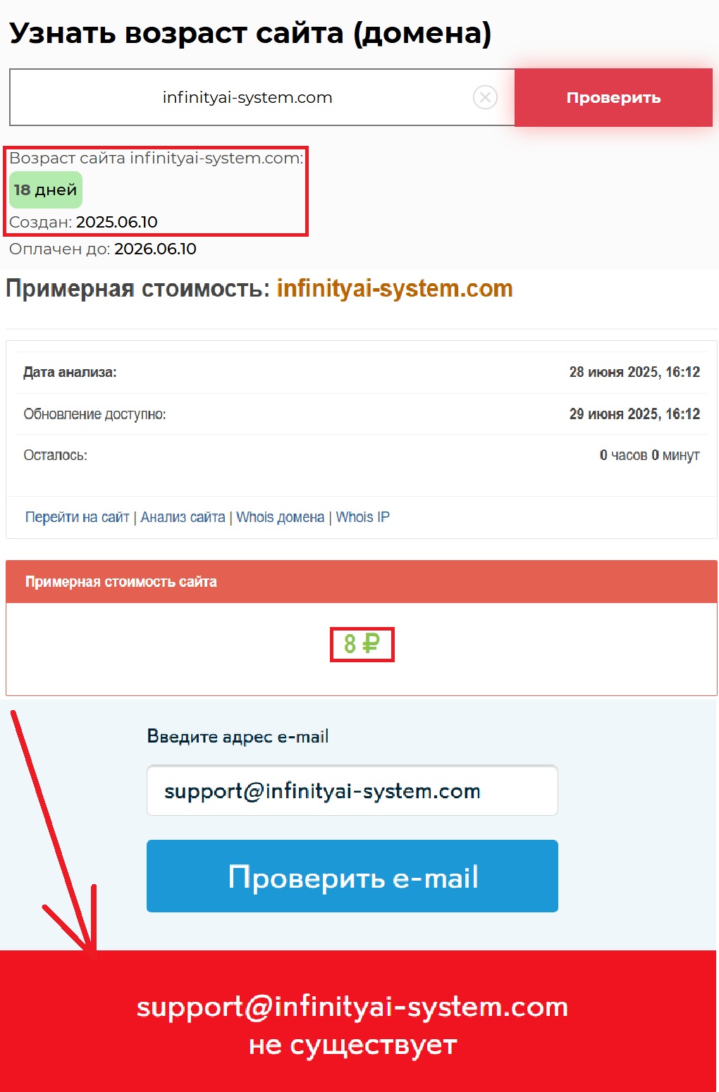 Прибавьте сюда еще один момент: стоимость этой «конторы» всего 8 рублей. Разве серьезный брокер стоил бы таких денег? Очевидно, что нет. Все это наглядно показывает, что перед нами не финансовый посредник, а дешевая подделка, рассчитанная на доверчивых людей. Из контактов для круглосуточной поддержки, которую нам обещают есть только почта support@infinityai-system.com, да и та фальшивая!