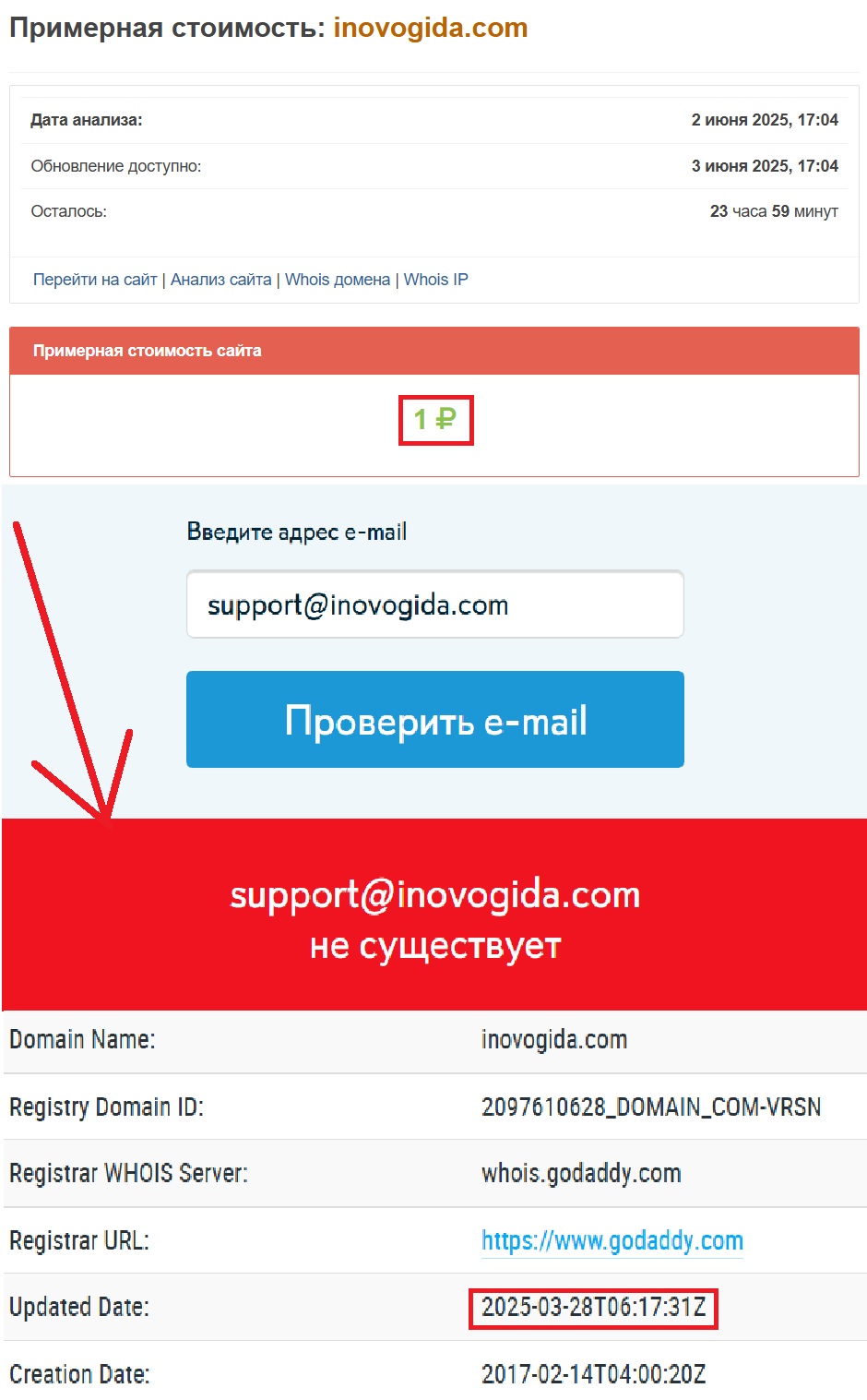 Теперь о дате создания. Формально, домен появился 14 февраля 2017 года. Но стоит копнуть глубже — и становится ясно: эта страница раньше принадлежала другому проекту, и мошенники просто купили ее, чтобы прикинуться «старичками» рынка. 28 марта 2025 года они провели перерегистрацию и с тех пор выдают себя за опытную платформу. Классика. Создание видимости стажа — старый трюк, но, к сожалению, до сих пор работает на доверчивых инвесторах. Из контактной информации есть только фальшивая почта support@inovogida.com.