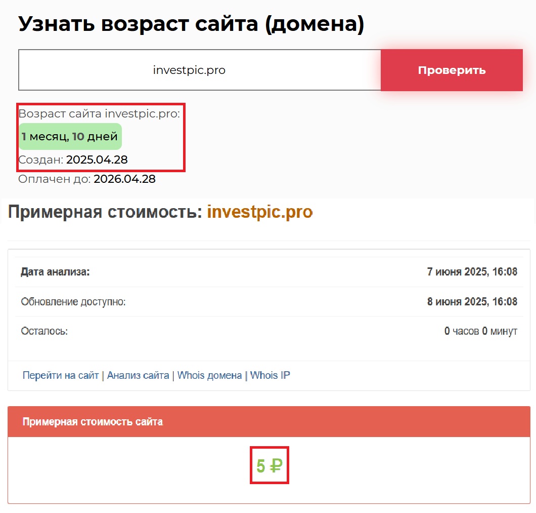 Вы можете спросить: а может, это новая компания, и они просто не все успели доделать? Возможно. Только вот если начать копать глубже, все выглядит гораздо мрачнее. Проведя проверку через независимые сервисы, мы узнали, что сайт Invest-Pic существует 1 месяц и 10 дней — вот и весь “опыт”. Не густо, правда? А теперь представьте, насколько легко закрыть подобную площадку, прихватив с собой все деньги инвесторов. Завтра они просто исчезнут — и ищи их потом.