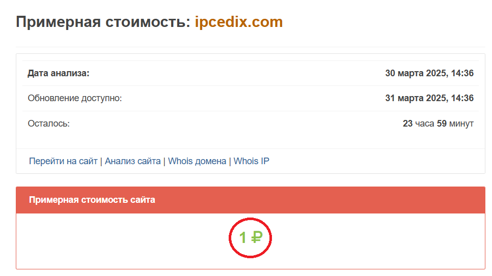 Однако мы сразу же поспешим отметить несколько подозрительных нюансов. Проверка домена ipcedix.com показывает, что он был зарегистрирован 6 февраля 2025 года. Получается, что пространство функционирует около 2 месяцев. Оценка его примерной стоимости равняется всего к 1 рублю, что также подрывает доверие (ведь какой серьезный и качественный проект выберет столь дешевое и примитивное оформление, так еще и с использованием стандартного шаблона).