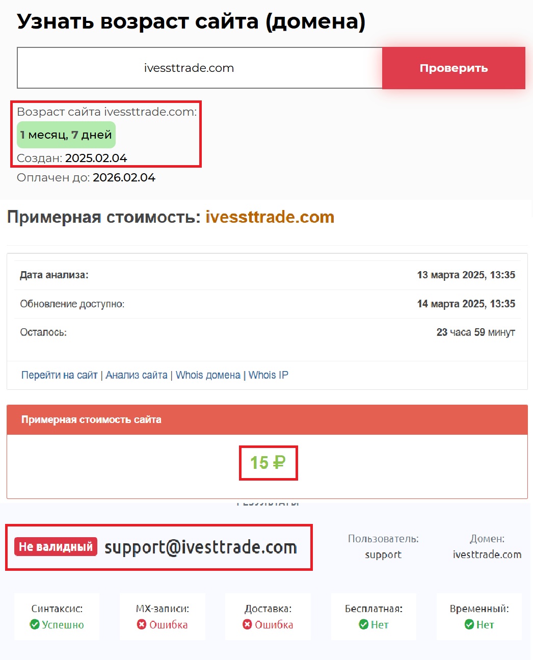 Но давайте к фактам. Ivesst Trade утверждает, что работает в США, а значит, должен предоставить какие-либо номера лицензий от местных регуляторов. Мы проверили реестр, и, как и следовало ожидать, ни одного упоминания об этой «компании» там нет. Это уже прямое доказательство, что они не имеют права на финансовую деятельность. Что с возрастом проекта? 1 месяц и 7 дней. Серьезно? Разве так выглядят солидные инвестиционные компании? Конечно, нет. Это просто очередной однодневный проект, который исчезнет так же быстро, как и появился.