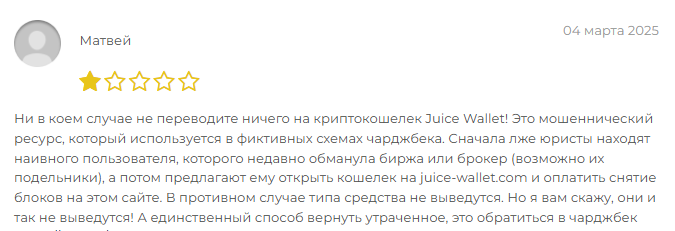 Подтверждают мошеннический характер кошелька и многие инвесторы. На неподконтрольных аферистам порталах юзеры пишут негативные отзывы о Juice Wallet и призывают не связаться с этим лохотроном. Люди указывают на отсутствие возможности выводить финансы и потерю собственных депозитов. Кроме этого, в откликах часто упоминается о том, что обещания выгодных курсов и минимальных комиссий не соответствуют реальности, а фактические условия взаимодействия оказываются не такими привлекательными.