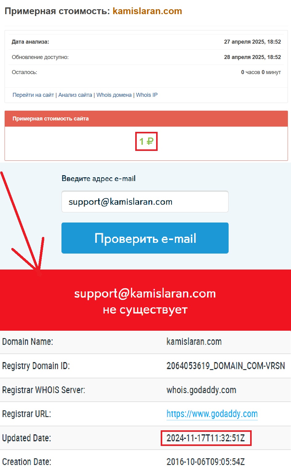 Провели проверку через сторонние сервисы — результаты, мягко говоря, удручающие. Сайт появился в сети всего пару месяцев назад, 17 ноября 2024 года. Серьезная организация за такой срок просто физически не успела бы развиться. Да что там развиться — хотя бы минимально заслужить доверие. А стоимость домена в 1 рубль? Это все, что нужно знать о «масштабах» компании.