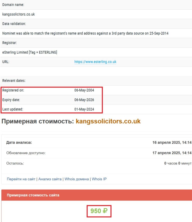 Еще немного цифр: домен www.kangssolicitors.co.uk был зарегистрирован в далеком 2004 году. Из-за этого некоторым может показаться, что перед ними достойный проект с солидной историей. Но поспешим разочаровать, ведь в действительно это не так. Активная работа на платформе началась только с момента его обновления — 1 мая 2024 года. Что было с пространством до этого неизвестно.