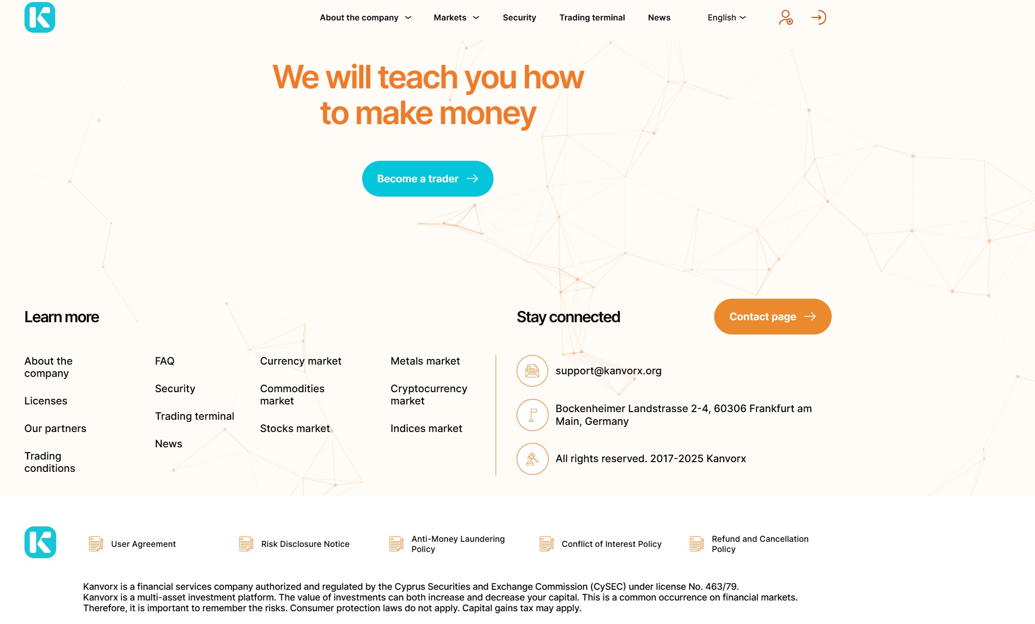 Даже банальный анализ стоимости сайта многое говорит о проекте. Стоимость — ровно ноль рублей. Ни одна уважающая себя компания не позволит себе работать на таком уровне. Зачем тратить деньги, если главная цель — собрать с доверчивых пользователей все, что можно, а потом исчезнуть? Контактная информация, которую указали организаторы Kanvorx, выглядит внушительно только на первый взгляд. Электронная почта support@kanvorx.org, адрес Bockenheimer Landstrasse 2-4, 60306 Frankfurt am Main, Germany. Но стоит только попытаться воспользоваться этими данными, как становится ясно: дозвониться или дописаться туда невозможно. Адрес — фиктивный, почта тоже фейковая. Вы останетесь один на один со своей проблемой.
