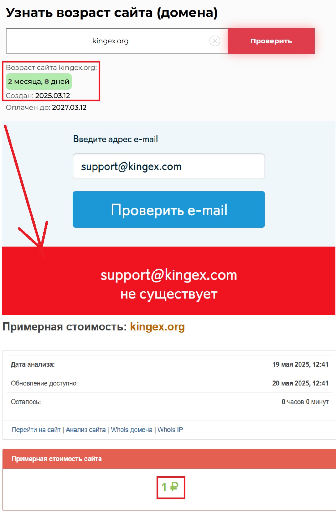 Интересный момент касается и «опыта» этой компании. Они утверждают, что работают давно. Ага, как же. Проверка показала, что домен сайта был зарегистрирован всего 2 месяца и 8 дней назад, то есть 12 марта 2025 года. Впечатляет? Ни капли. Стоимость всей этой клоунады — один рубль. Ну и как за такую сумму можно рассчитывать на серьезный подход? Разве легальная компания будет скрывать своих сотрудников, фальсифицировать адреса и придумывать липовые контакты? И, наконец, где лицензия? Где хоть одно упоминание о регуляторе? Нет. Потому что KingEX не регулируется никем. Они вне закона. И работают соответствующе.