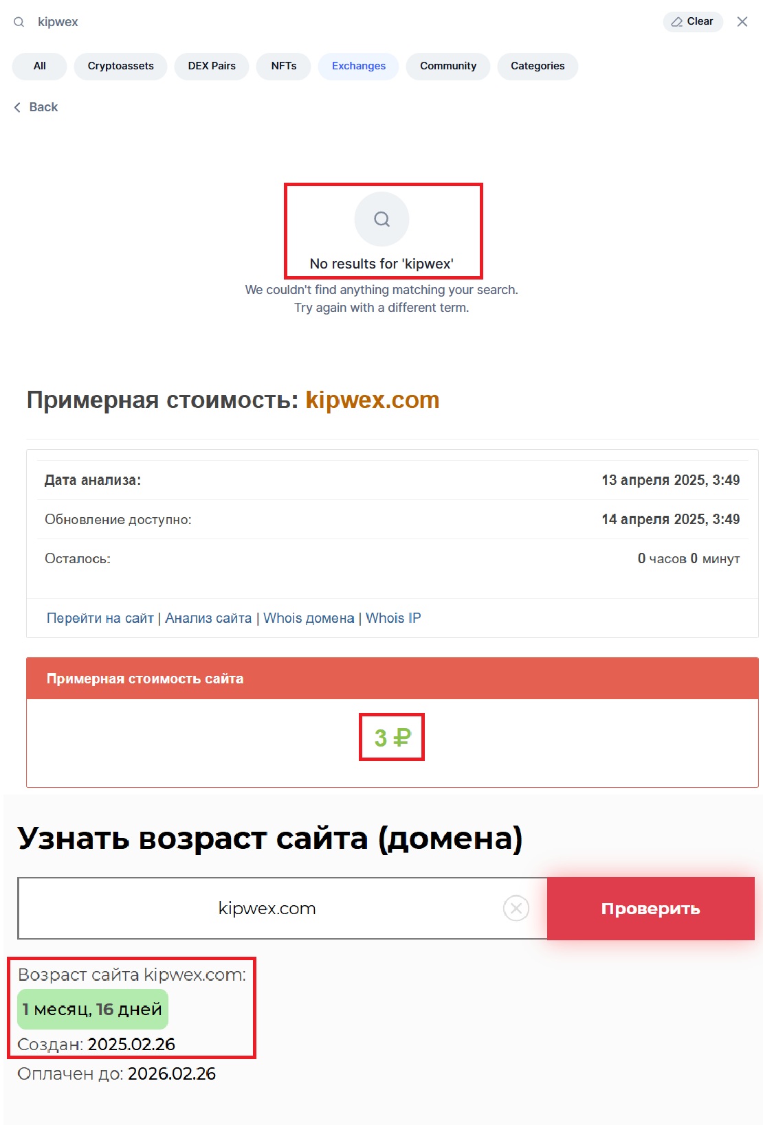 Обратите внимание на несколько признаков мошенничества, встречающихся в данном лохотроне. Во-первых, это малый возраст домена. Сайт kipwex.com был создан чуть больше месяца назад. Все бы ничего, если бы не столь громкие заявления злоумышленников относительно их «долгой истории на рынке».