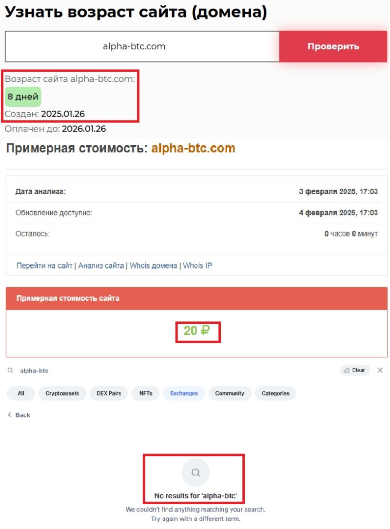 Герой данного обзора старается замаскировать свою мошенническую деятельность под легальную платформу, но просмотр истории домена через сервис для проверки возраста моментально раскрывает все карты. Стаж работы проекта составляет всего 8 дней, что для криптобиржи — ничтожный срок. Продвижение этой аферы ведется через социальные сети, мессенджеры и фейковые видеоролики на YouTube. Чаще всего пользователям предлагают легчайшую схему заработка, в которой достаточно купить криптовалюту на одной площадке и продать ее дороже на alpha-btc.