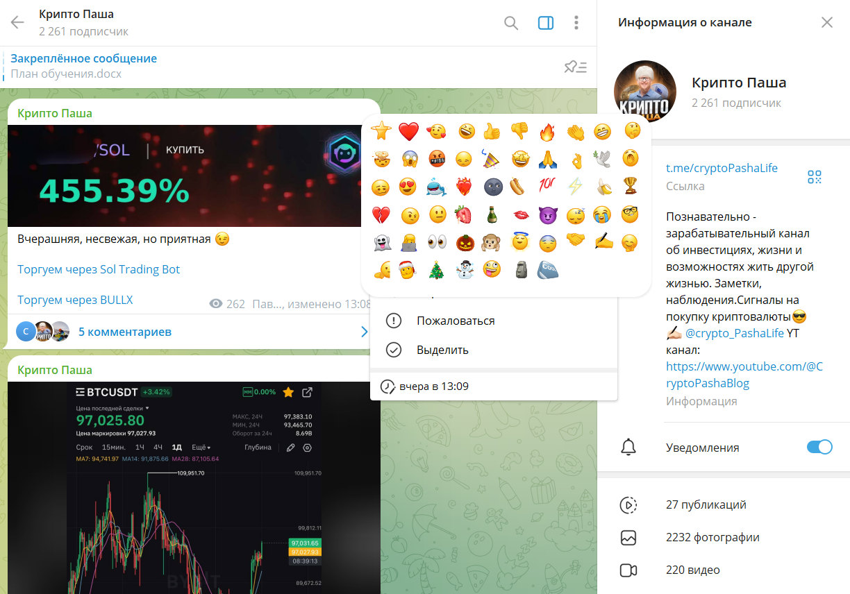 Среди публикаций в сообществе встречаются сведения о перспективных (по мнению создателя пространства) монетах, информация про мем коины, а также реклама криптовалютного бота Sol Trading Bot – New. Кроме этого, у собственника ресурса есть и платные предложения для аудитории. Среди них обучающие курсы, стоимость которых составляет 5500 рублей. Оплата за материалы принимается только в USDT. Но стоит ли курс таких денег? Однозначно нет.