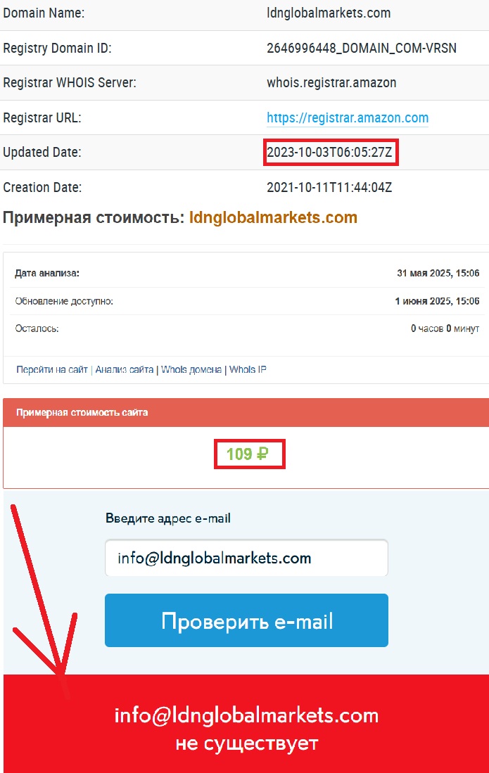 Что же с датой запуска проекта? Здесь все еще интереснее. Согласно данным, доступным в открытых источниках, сайт зарегистрирован в октябре 2021 года, выкуплен в 2023, а начал деятельность еще позже, жаль только что мошенники скрыли дату обновлений. Стоимость в 109 рублей напрочь отбивает желание инвестировать в этот лохотрон. Теперь обратим внимание на контактные данные. Их — минимум. Точнее, только электронная почта info@ldnglobalmarkets.com. Это не связь с клиентом, это — фикция. Единственный способ “пообщаться” — через форму обратной связи, которая, как мы все знаем, чаще всего работает только в одну сторону.