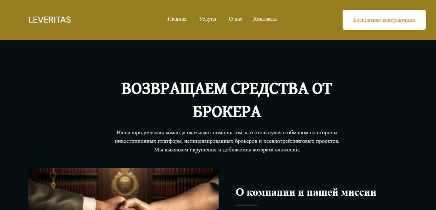 Взглянув на сайт упомянутой конторы, можно с легкостью подтвердить любые догадки о ее недобросовестном характере. Leveritas имеет шаблонную заготовку, которая визуально и структурно никак не отличается от десятка других фальшивых юридических проектов.