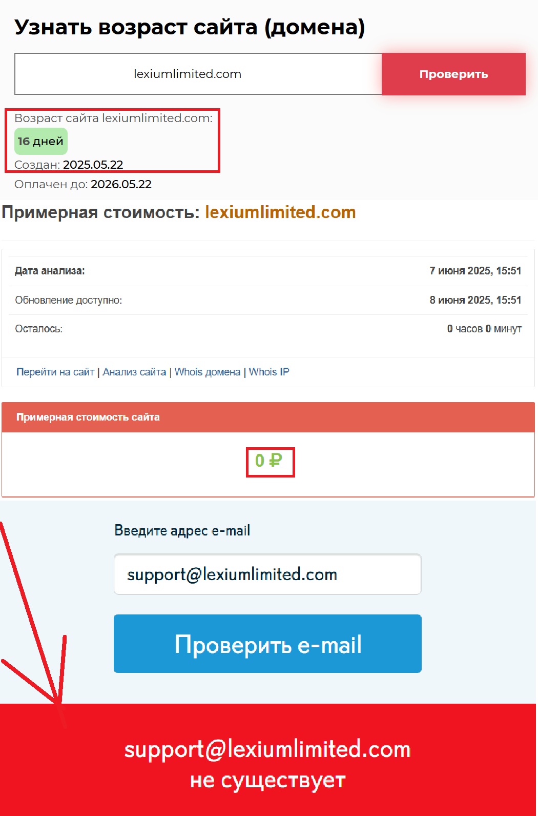 Нас также заинтересовал возраст проекта. И тут — сюрприз. LEXIUM LIMITED существует всего-то 16 дней. Да-да, он появился 22 мая 2025 года. Это не срок для компании, которая позиционирует себя как надежный посредник на финансовом рынке. Но для аферы? Более чем достаточно, чтобы собрать «урожай» из наивных инвесторов и исчезнуть.