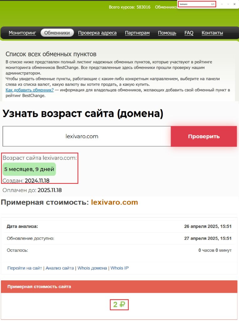 Кроме этого, можно отметить несколько фактов о домене. После анализа на специализированных порталах, можно узнать, что платформа была зарегистрирована около 5 месяцев назад. Ее примерная стоимость составляет всего 2 рубля (что считается очень и очень низким показателем, как для якобы серьезной компании). В списках авторитетных мониторингов Lexivaro нет.