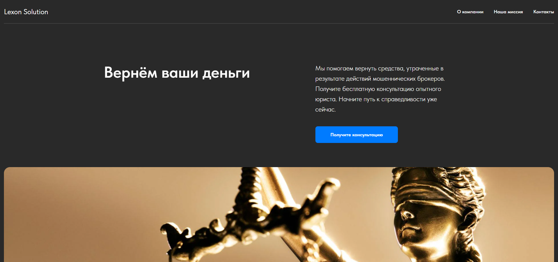 Возьмем для примера фальшивую юридическую фирму Lexon Solution. Ее создатели позиционируют себя как лучших помощников в процедуре чарджбека. Они красиво пишут о своей компетентности, опытности и желании помочь каждому пострадавшему от рук нечестных брокеров, лжебирж и др. Но что же люди получают на самом деле? Абсолютно ничего из ранее упомянутого.