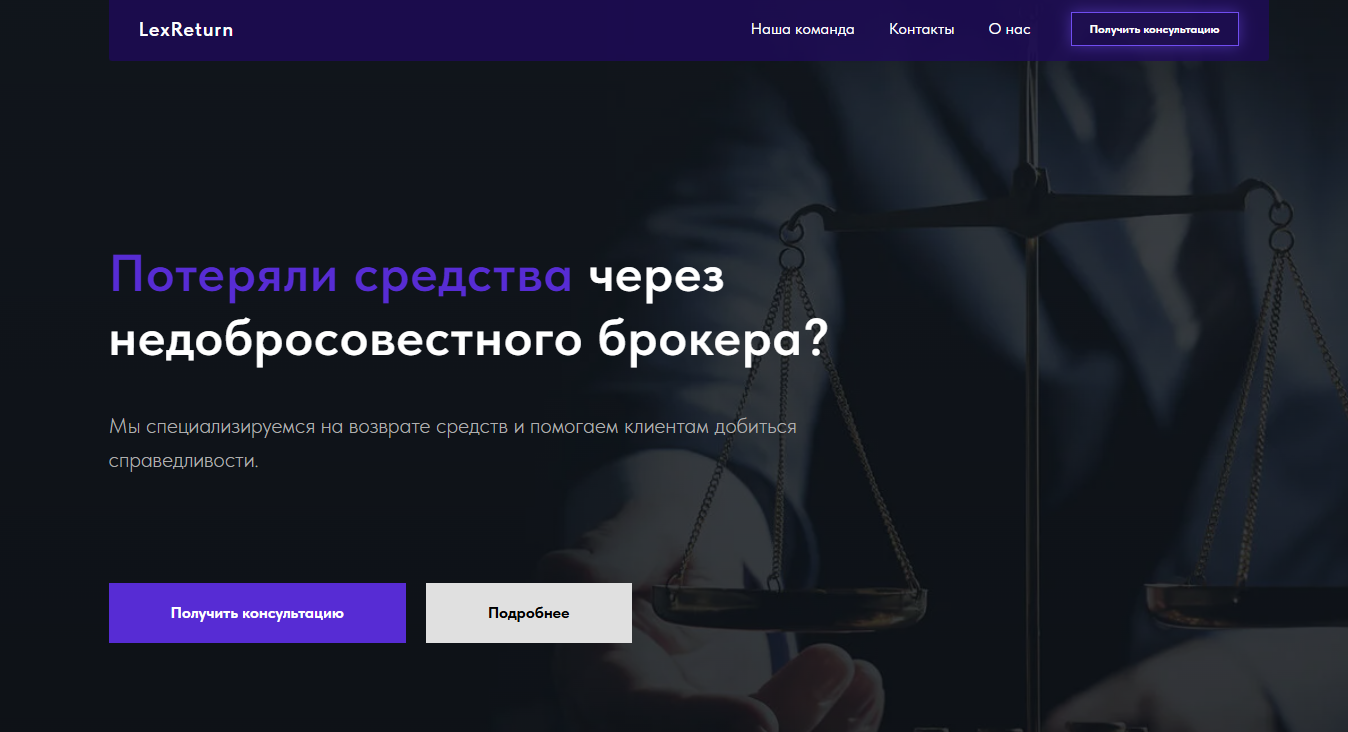 По такому же принципу решили действовать преступники из LexReturn. Попадая на сайт этих аферистов, видим типичную схему (только с новым логотипом).