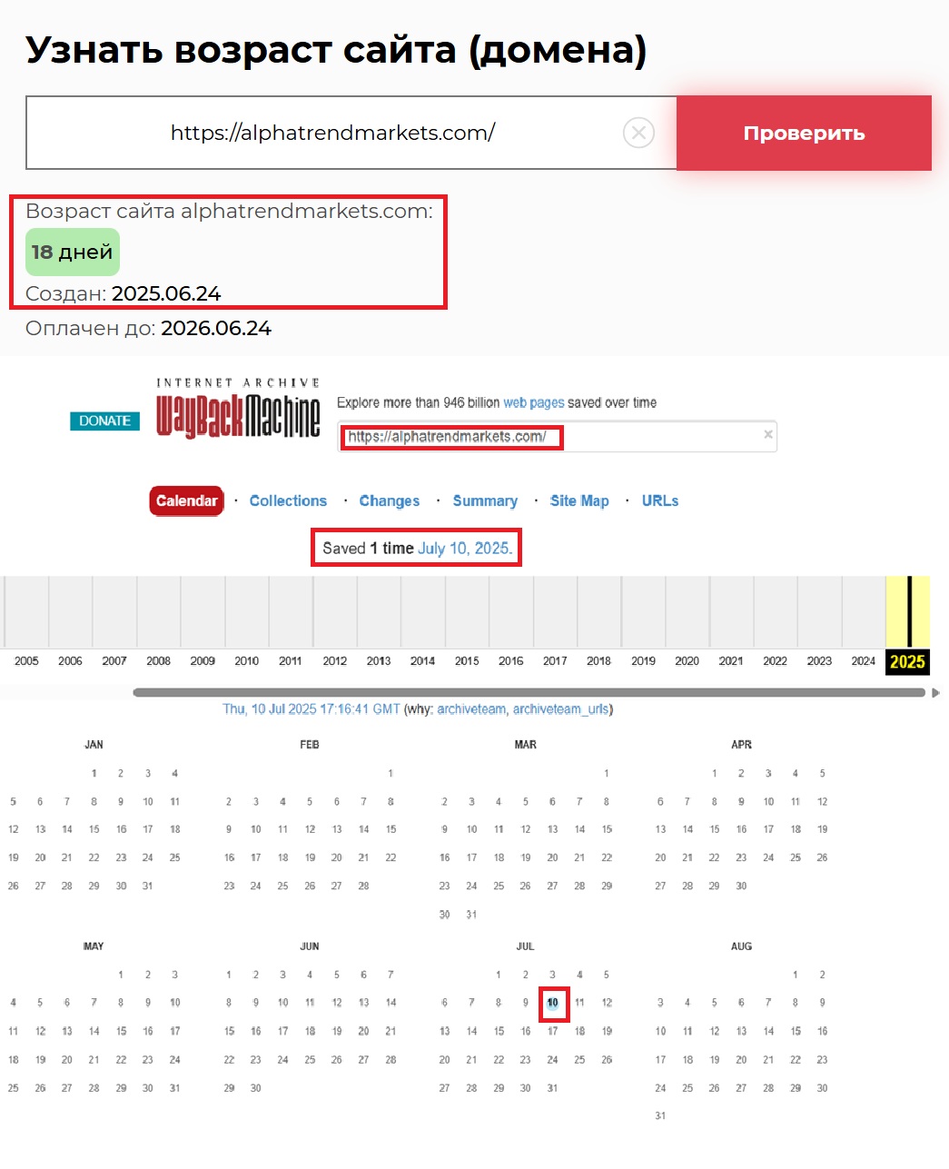 Стоит только проверить дату создания домена через Whois (https://who.is/whois/alphatrendmarkets.com), и становится ясно: платформа стартовала лишь 24 июня 2025 года. То есть все разговоры о “десятилетнем опыте на рынке” — банальный вымысел. При этом на сайте указано, что брокер предоставляет “международные услуги” и “лицензирован ведущими регуляторами”. Только вот ни одной ссылки вы там не найдете.
