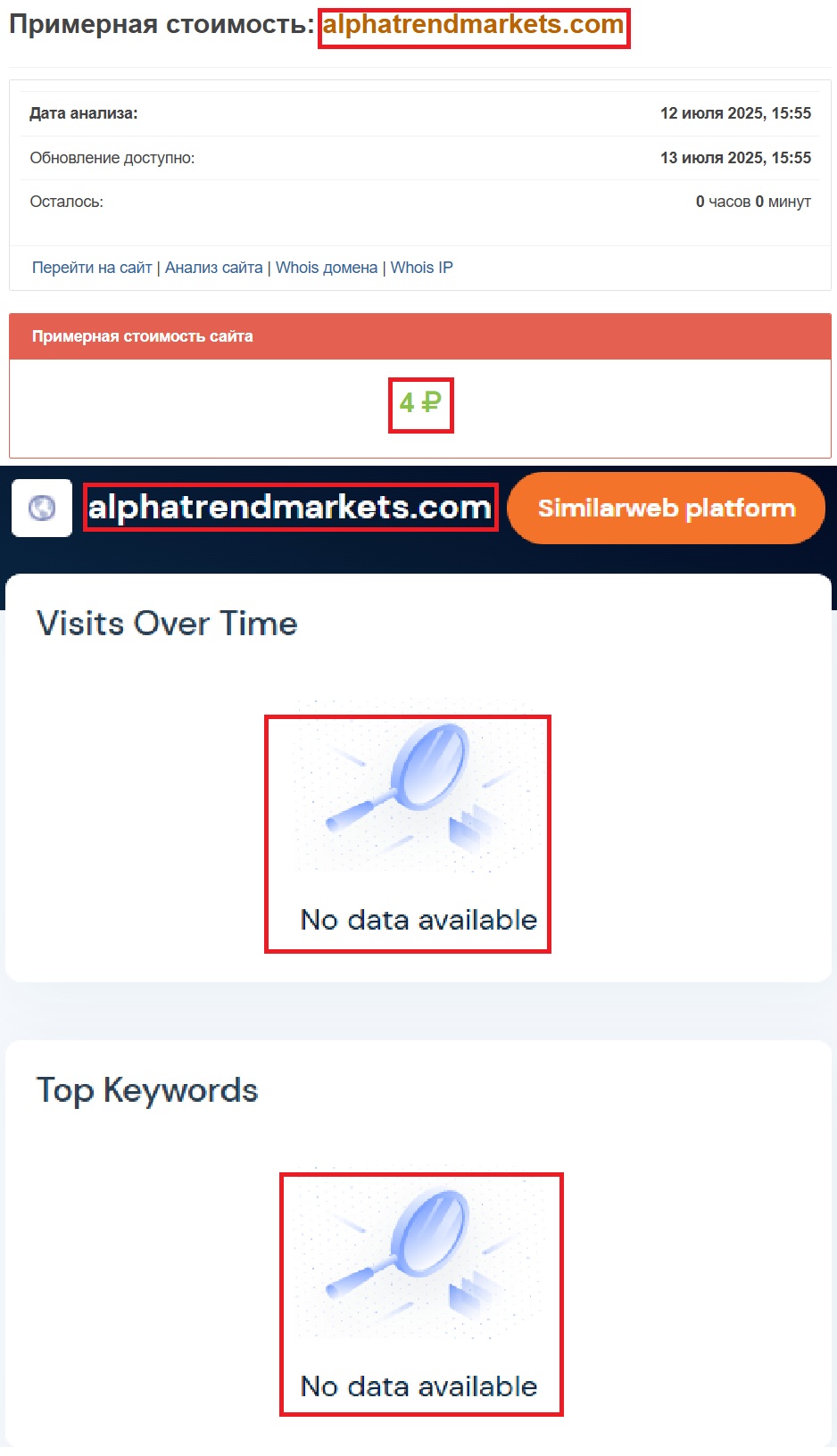 Проверка через Веб Архив (https://web.archive.org/web/20250000000000*/http://alphatrendmarkets.com/), сохраняющий копии того или иного веб-ресурса на протяжении всех лет его работы, также дает интересный результат — единственная сохраненная копия была сделана 10 июля 2025 года. История? Отзывы? Репутация? Ничего этого у проекта попросту нет. Стоимость сайта — копеечная, по данным Seolik — 4 рубля. Нормальный брокер на такие суммы даже не рассчитывает. А если заглянуть в статистику посещаемости от SimilarWeb — там тишина, почти нулевой трафик. Все это подтверждает: Alpha Trend Markets — не платформа, а очередная ловушка для доверчивых инвесторов.