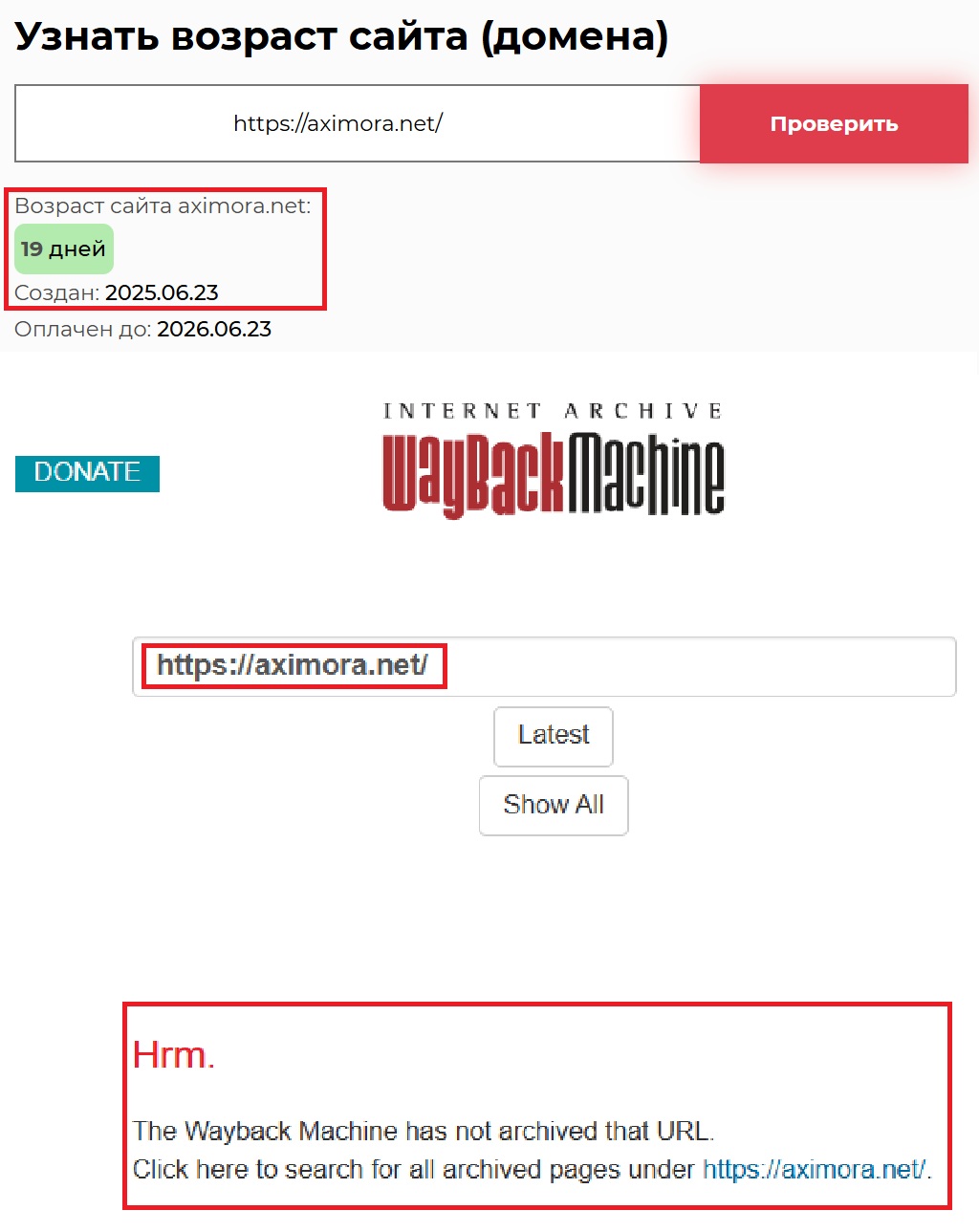 — Возраст сайта — менее 3 недель, домен создан в конце июня 2025