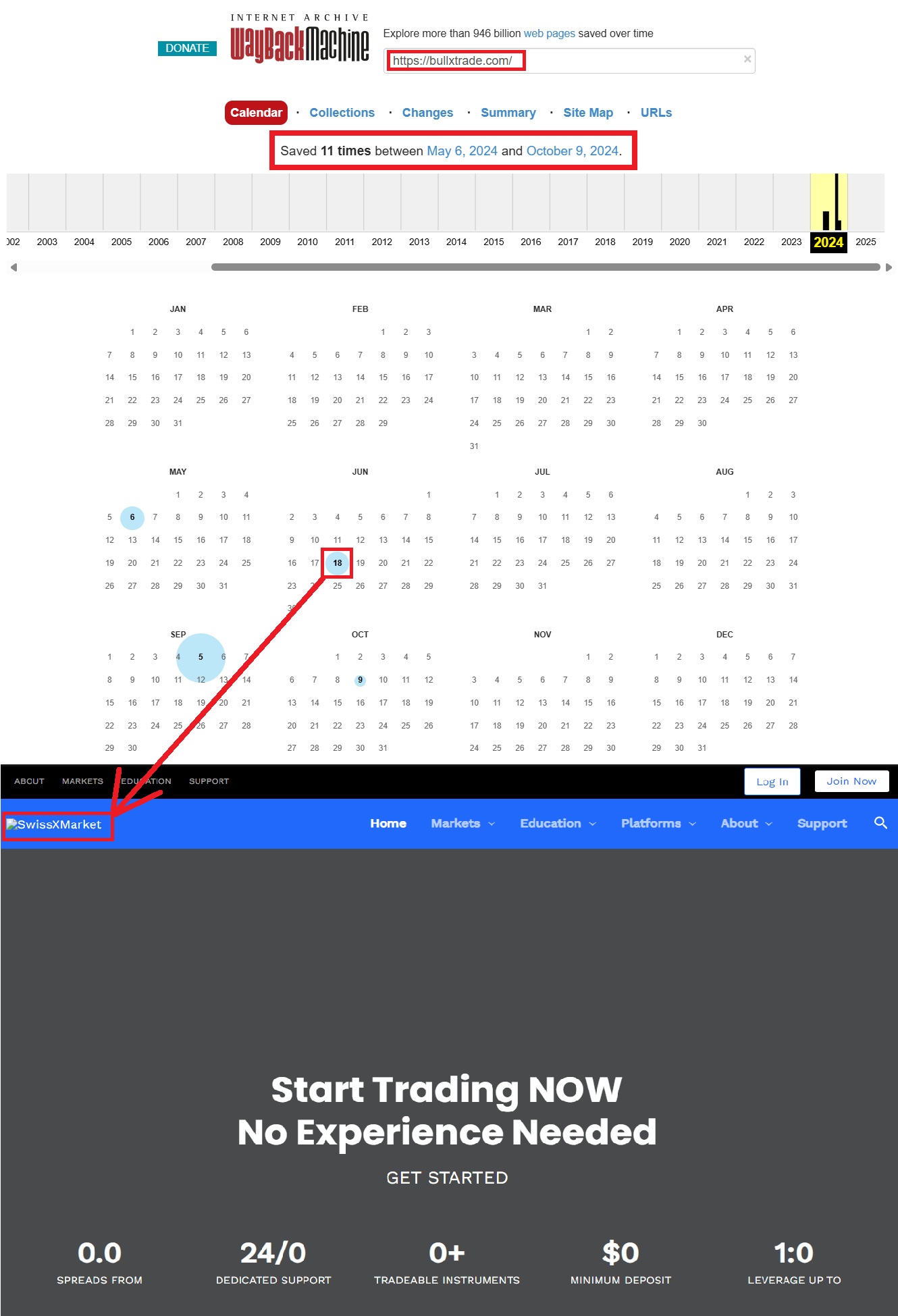 Начнем с банального — проверим, сколько живет этот сайт. Веб-Архив (https://web.archive.org/web/20240501000000*/https://bullxtrade.com/), сохраняющий копии того или иного веб-ресурса на протяжение нескольких лет, показывает: якобы проект работает с 6 мая 2024 года. А если открыть внешний вид домена 18 июня 2024, то можно обнаружить что он принадлежал проекту под названием SwissXMarket. Все просто: домен купили, придумали легенду и стали рассказывать о «годах опыта». Только вот раскрыть реальную деятельность очень просто.