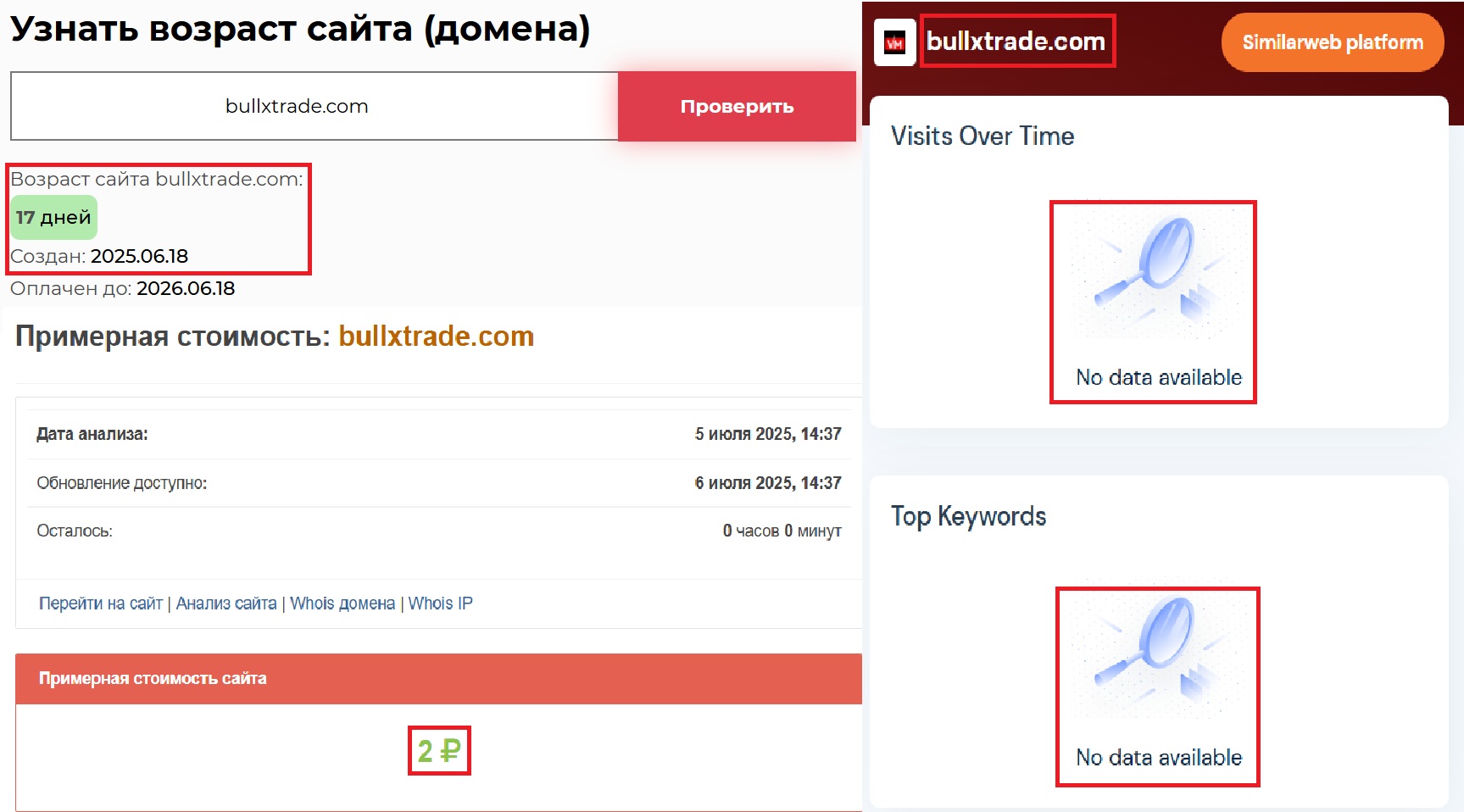 А теперь самое интересное — цена сайта. Согласно Seolik, его стоимость — два рубля. Вы правда думаете, что надежная финансовая компания работает с таким “инструментом”? Мы заглянули и в Whois (https://who.is/whois/bullxtrade.com) — сервис проверки истории домена: он зарегистрирован 18 июня 2025 года, то есть реальный возраст составляет всего лишь 17 дней. Вишенка на торте — SimilarWeb. Посещаемость практически нулевая, значит, проект никому не интересен. И это при такой-то “миссии”.