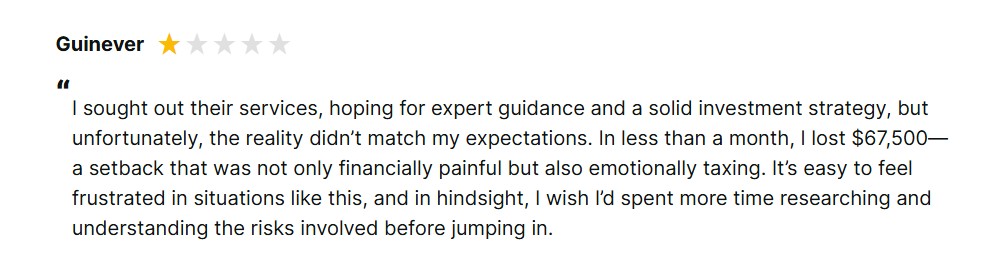 “Bullxtrade — это развод века! Я не верила что такое до сих пор существует, но меня развели по полной. Даже заставили взять кредит чтобы максимизировать прибыль. Буду честна, вам не стоит сотрудничать с такими откровенными лохотронами!”