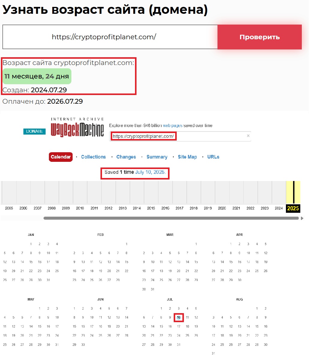 Начнем с даты создания сайта. Сервис Whois (https://who.is/whois/cryptoprofitplanet.com) — платформа, где можно узнать техническую информацию о домене, — показывает, что сайт зарегистрирован совсем недавно — 29 июля 2024 года. Это уже вызывает подозрения. Далее — Веб-Архив (https://web.archive.org/web/20250000000000*/https://cryptoprofitplanet.com/), хранящий дизайн сайтов в разные периоды. Площадка Crypto Profit Planet занесена в архив один раз — 10 июля 2025 года, что лишь подтверждает недавнее появление этого лохотрона, а значит, все их «годы опыта» — фикция.