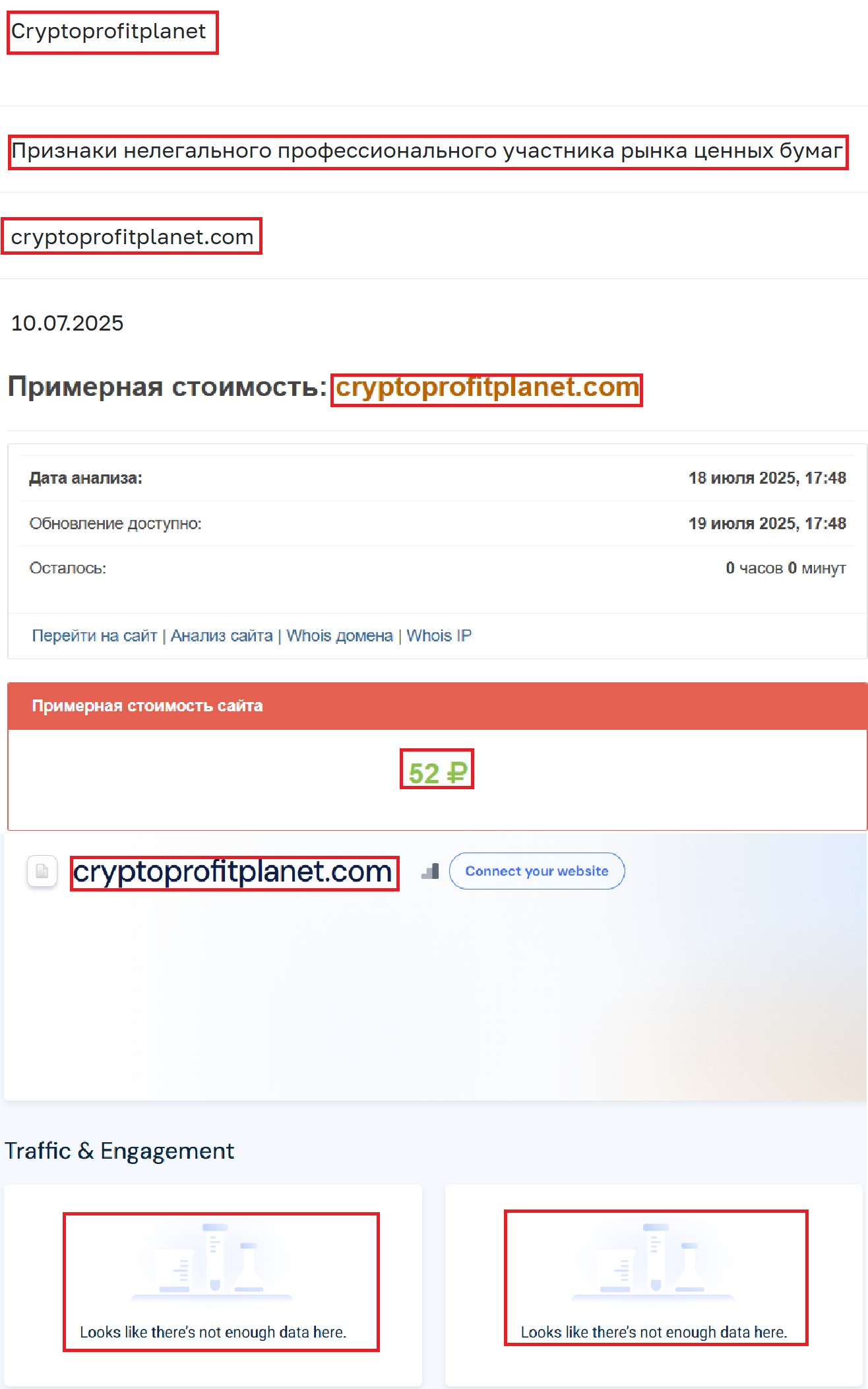 Сервис Seolik, позволяющий оценить примерную стоимость сайта, показывает: ресурс почти ничего не стоит — цена 52 рубля. Серьезные брокеры вкладывают в IT-инфраструктуру миллионы, а тут — копейки. Заглянем еще в SimilarWeb — инструмент аналитики трафика. Платформа показывает мизерное количество посетителей и почти полное отсутствие активности. И, что важно: Центральный банк РФ включил Crypto Profit Planet в официальный список нелегальных финансовых организаций (http://www.cbr.ru/inside/warning-list/detail/?id=38883), что ставит жирную точку в вопросе доверия.