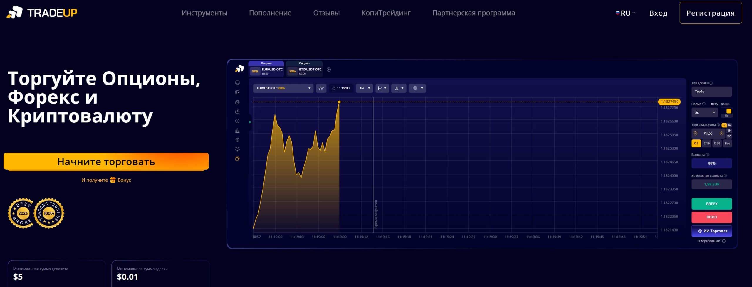 «Торгуйте Опционы, Форекс и Криптовалюту» — так вас встречает TradeUp (tradeup.net). Казалось бы, обычный брокер с красивым слоганом. Но давайте не будем верить первым словам. Обещания 100% прибыли за пару дней — это уже тревожный сигнал. Так не бывает. А если вам пытаются доказать обратное — значит, что-то здесь точно не так. Посмотрим детальнее, что скрывается за этим «инвестиционным проектом».