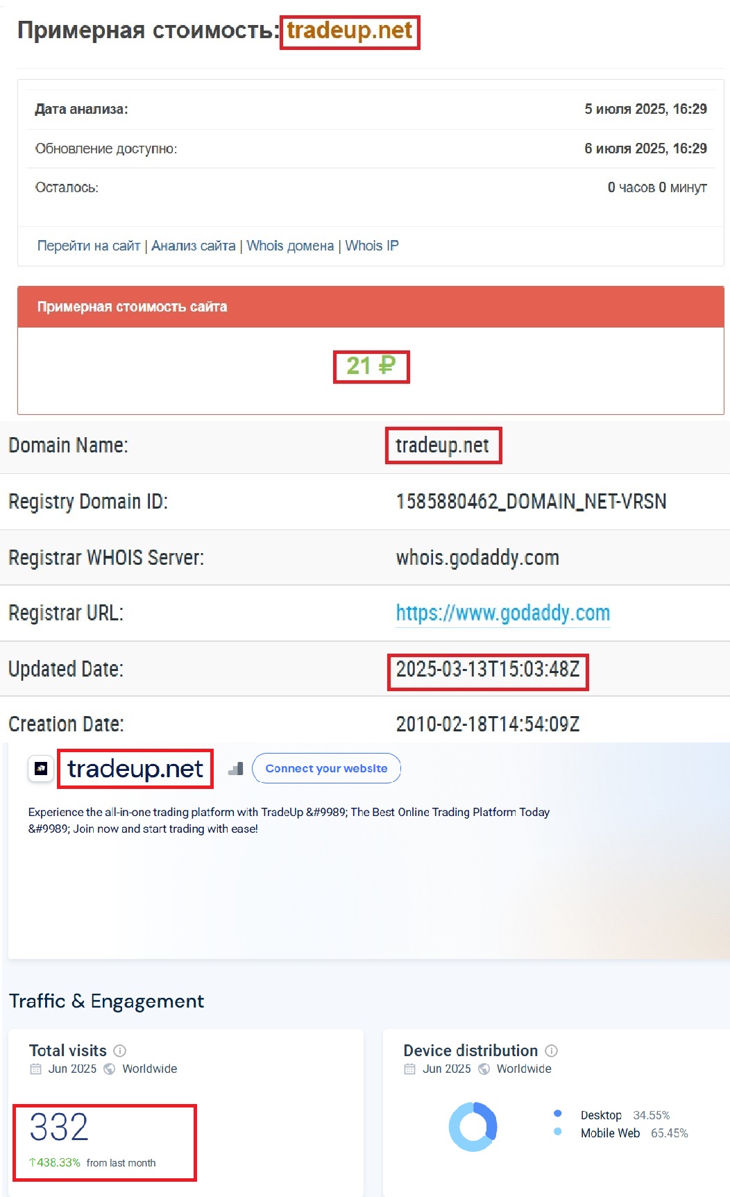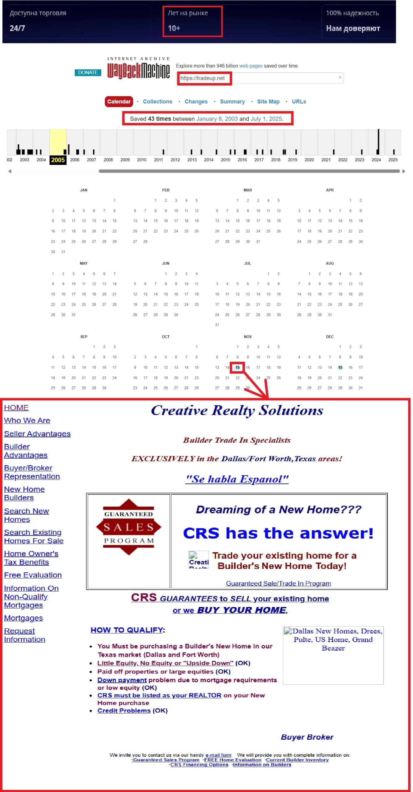 Сначала — технический момент: возраст сайта. Через сервис Whois (https://who.is/whois/tradeup.net) легко выяснить, что домен зарегистрировали еще 18 февраля 2010 года. Только вот сам сайт запустили значительно позже — 13 марта 2025-го. Почему так? Все просто — мошенники купили чужой домен, чтобы создать иллюзию «опыта и надежности». На деле — чистый обман. Хотите убедиться? Заходите на Веб-Архив (https://web.archive.org/web/20050415000000*/https://tradeup.net/), где хранятся копии того или иного домена за весь период его существования. Как вы видите на скриншоте ниже, проект купил домен, который раньше принадлежал совсем другой компании.