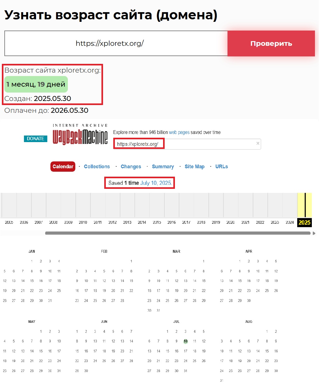 Сайт утверждает, что работает с 2014 года, но даже поверхностная проверка показывает полную фальшь. Заглянем в Веб-Архив(https://web.archive.org/web/20250000000000*/https://xploretx.org) и первая зафиксированная копия сайта появилась только 10 июля 2025 года, а домен был зарегистрирован 30 мая 2025 года по данным Whois ((https://who.is/whois/xploretx.org). Это значит, что проекту всего 1 месяц и 19 дней — а не “7 лет”, как написано на главной странице.
