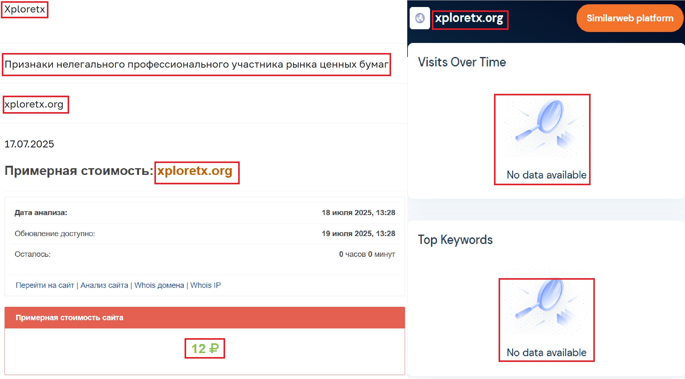 Так же  проект заявляет, что предоставляет услуги на финансовом рынке, он должен быть зарегистрирован в соответствующих надзорных органах. Мы проверили Xploretx в базе Центрального Банка РФ(http://www.cbr.ru/inside/warning-list/detail/?id=39042), и результат говорит сам за себя: выявлены признаки нелегального профессионального участника рынка ценных бумаг.
