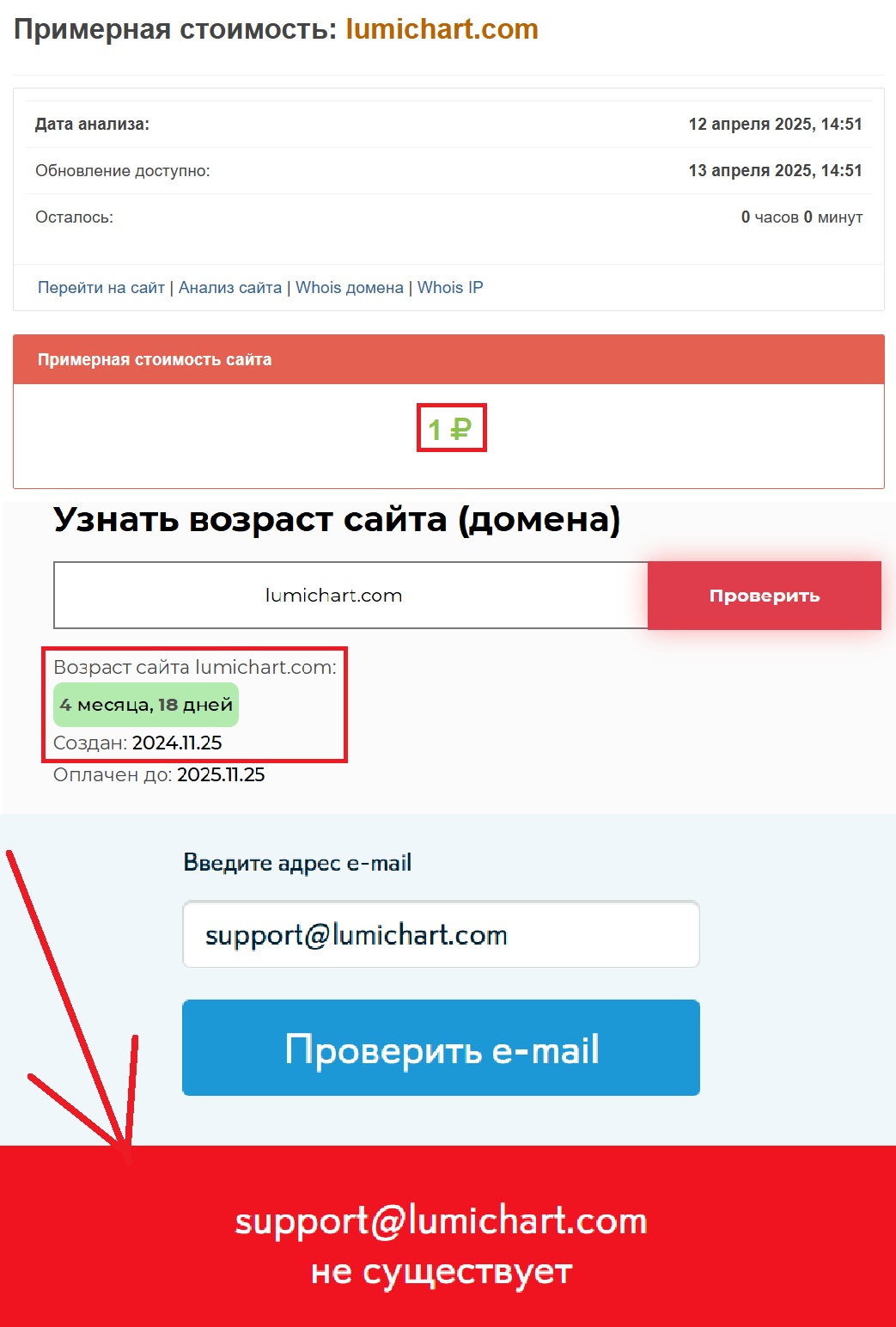Нам стало интересно — насколько этот проект вообще свежий? Проверили через сторонние сервисы и, как и ожидали, ресурс существует всего 4 месяца и 18 дней. За такой срок невозможно построить ничего стоящего в мире финансов. Настоящие компании идут к своей репутации годами, строят отношения с клиентами, работают открыто. А тут — две с половиной недели и сайт, стоимость которого составляет один рубль. Ну как вы считаете, это похоже на сервис, которому стоит доверять свои деньги?