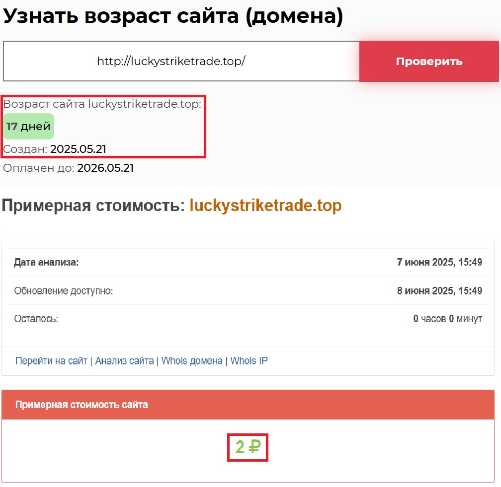 Что же с лицензией? Ответ короткий: ее нет. А значит, никаких гарантий, никаких обязательств, никакой защиты ваших вложений. Кстати, о дате регистрации. Тут отдельная история. По данным сервисов, сайт появился только 17 дней назад, то есть 21 мая 2025 года. Впечатляет, не правда ли? Стоимость этого примитивного развода составляет ровно два рубля, так что о каком инвестировании с брокером может идти речь?