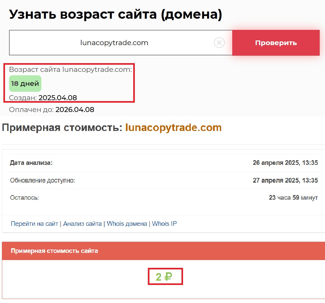 Вы знаете, мы всегда советуем проверять компании через сервисы Whois или Seolik, и LunaCopyTrade тут тоже не прошел проверку. Конечно, они красиво рассказывают про долгую и успешную работу на рынке. Только вот, если посмотреть правде в глаза, все становится ясно: сайт был зарегистрирован 18 дней назад, то есть 8 апреля 2025 года. То есть стажа у них — кот наплакал. Всего несколько месяцев. И это компания, которой можно доверить свои инвестиции? И самое главное — никакой лицензии, никакой регистрации у LunaCopyTrade попросту нет. Все, что они обещают, держится исключительно на красивых словах. А когда дело доходит до реальных дел, оказывается, что никто ни за что не отвечает.
