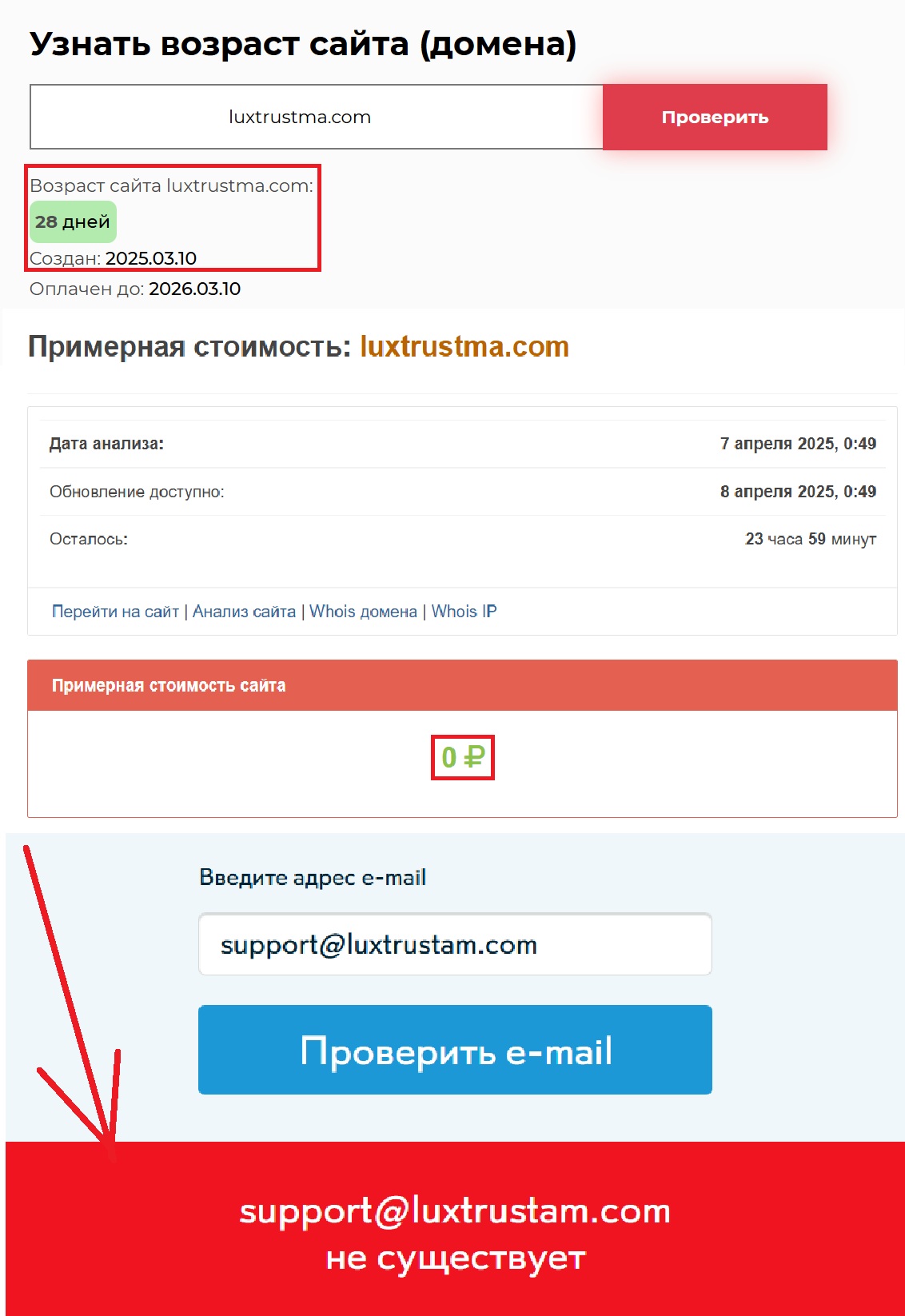 И знаете, что самое печальное? Это даже не скрывается особо. Никаких лицензий, никакой реальной регистрации. Да о чем вообще речь, если проверка через обычный Whois показывает, что сайт-то появился только в 10 марта 2025 года? 28 дней в онлайне — и они уже успели пообещать десятилетний стаж и сотни довольных клиентов. Забавно, правда? А если посмотреть на цену домена, то становится совсем грустно — ноль рублей. Ну то есть это даже не ирония, это плевок в сторону здравого смысла.