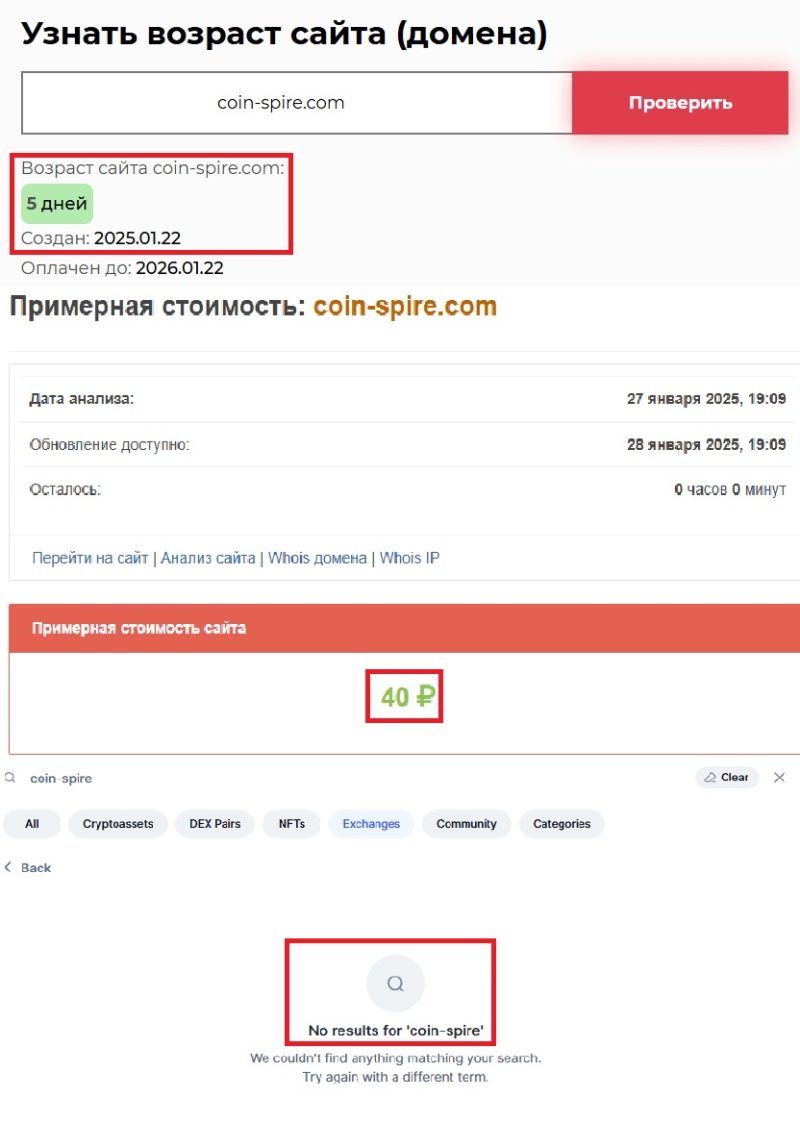 Если углубиться в детали, то проверка специальными сервисами только подтверждает, что мы имеем дело с мошенническим проектом. Стоимость сайта составляет всего 40 рублей. Лицензии и регистрации от реальных надзорных органов у Coin-Spire не имеется. Это значит, что проект работает вне рамок закона, и любые обещания о доходах — всего лишь уловка для доверчивых пользователей. Возраст мошеннического проекта также вызывает сомнения.