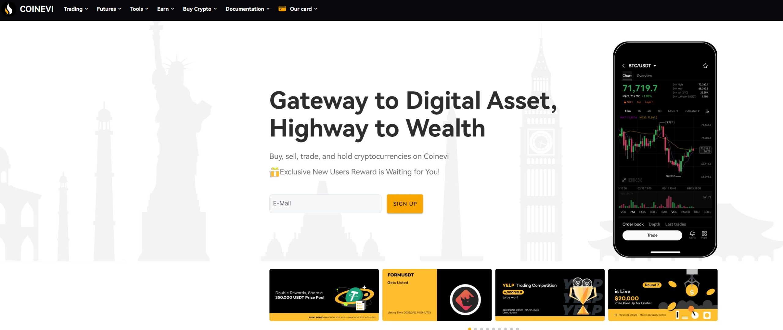 «Путь к цифровым активам, путь к богатству!» — именно так встречает пользователей хайповая биржа Coinevi (coinevi.com). На площадке словно обещают идеальные условия: молниеносный вывод, собственные алгоритмы, прибыль без усилий. Однако если покопаться глубже — сразу выявляются явные признаки фальшивки, маскирующейся под серьезный проект.