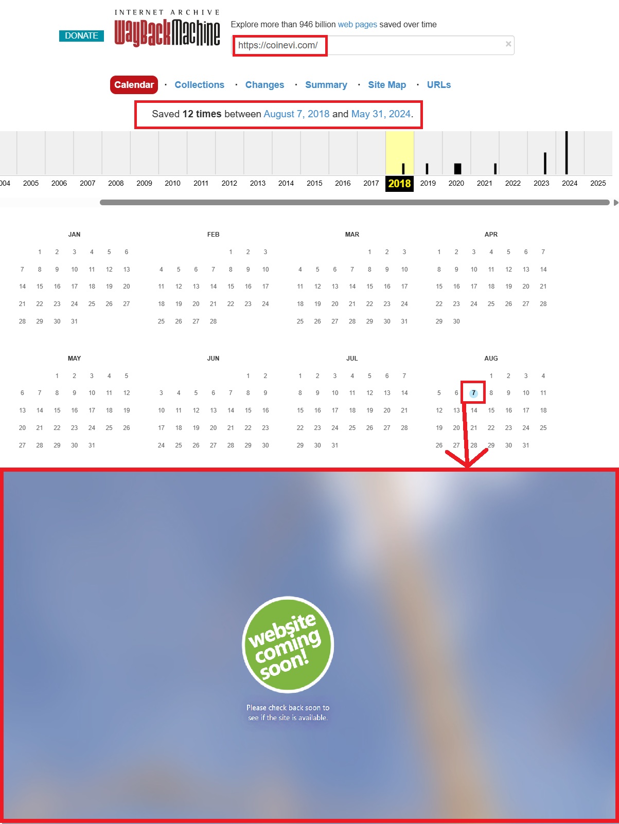Первое, на что стоит обратить внимание, — это анализ домена с помощью Whois (https://who.is/whois/coinevi.com): оказалось, что coinevi.com зарегистрирован лишь 23 июня 2025 года, а не много лет назад, как заявлено. Следом проверка в Wayback Machine (https://web.archive.org/web/20180807192054/https://coinevi.com/) — архиве с историей сайтов — показала, что сайт существует с 7 августа 2018 года, но на тот момент, как видно на скриншоте, этот веб-ресурс только разрабатывался.