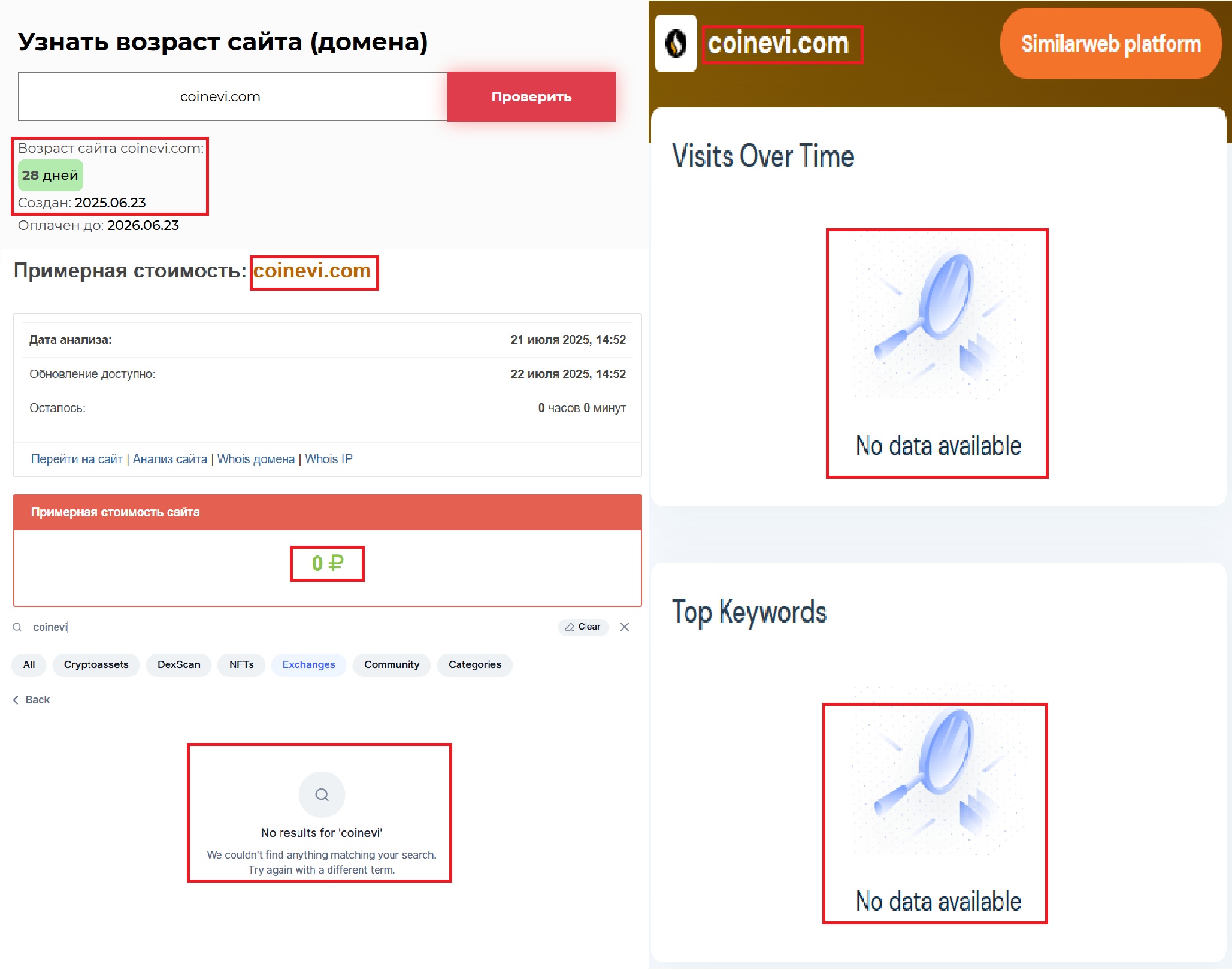 — Нулевая посещаемость, отсутствие упоминаний на CoinMarketCap или SimilarWeb