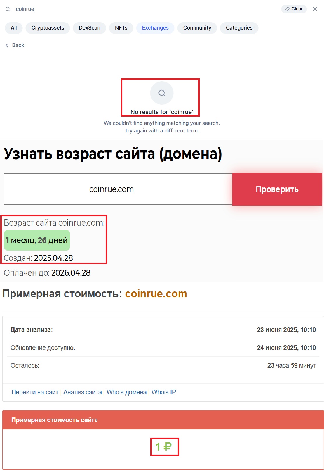 Мы проверили домен через независимые источники. Оказалось, что он был зарегистрирован всего 1 месяц и 26 дней назад. То есть вся история, которой гордится Coinrue, попросту выдумана. Добавим к этому тот факт, что стоимость сайта составляет всего 1 рубль — и все встает на свои места. Серьезная биржа не станет экономить на своем “лице», согласны?