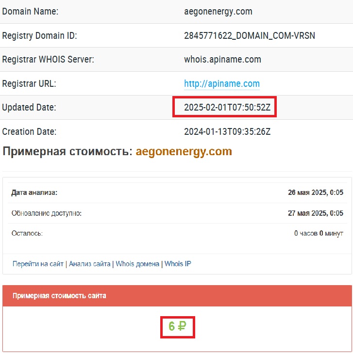Они активно ведут кампании в соцсетях и мессенджерах. Публикуют фальшивые отзывы, рисуют красивые истории успеха. Но за всем этим — пустота. Ни платформы, ни команды, ни инструментов, которых они якобы предоставляют. Графики? Да, они есть. Только вот такие графики сегодня можно вставить на любой сайт за пять минут. Реальной аналитики — ноль. Платформа создана не для работы, а для сбора денег. Нам стало интересно: сколько может стоить такой «проект»? Оказалось — всего шесть рублей. Серьезно, стоимость Aegon Energy, по данным сторонних проверок, составляет именно столько. Вопрос: вы бы доверили свои сбережения проекту, который стоит дешевле булочки? Мы — точно нет.