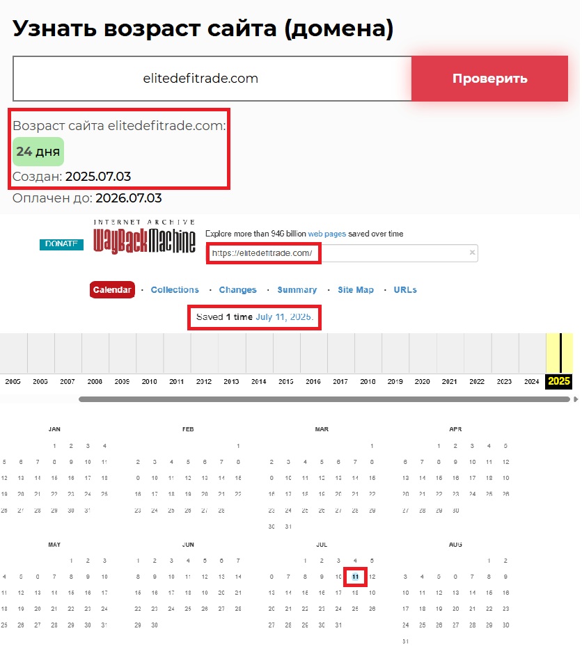 — Домен elitedefitrade.com создан совсем недавно (3 июля 2025 года), легенда о «долгой истории» — выдумка