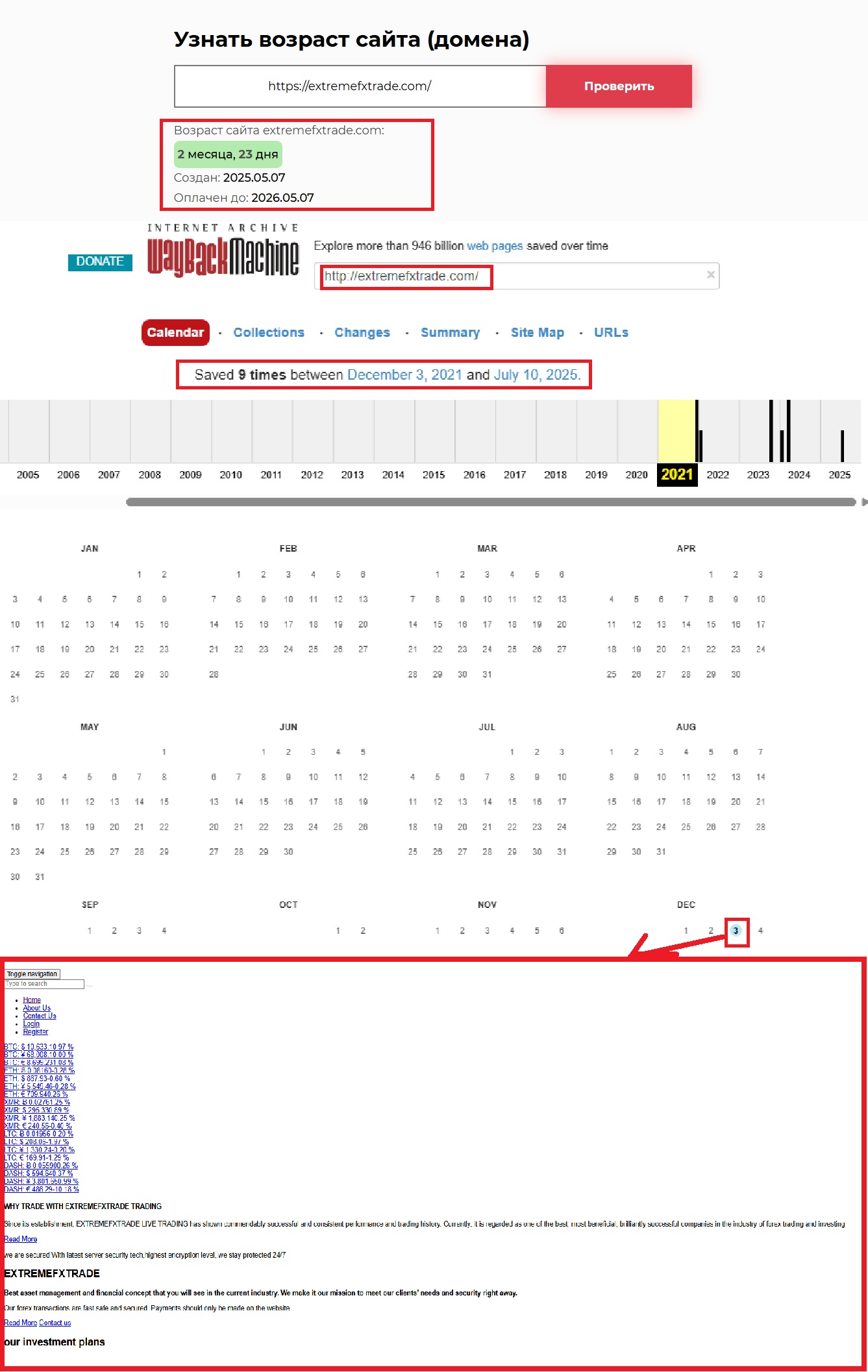 Смотрим, что говорят факты. Whois (https://who.is/whois/extremefxtrade.com) — сервис, показывающий дату регистрации домена — дает точную дату создания сайта: 7 мая 2025 года. То есть проекту даже трех месяцев нет, а они уже успели «десять лет помогать инвесторам»? Неубедительно.